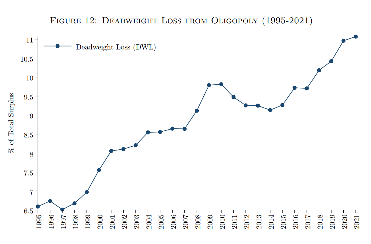 Oligopolies create significant inefficiencies, at the expense of the consumer. This was proven by [Bruno Pellegrino](https://papers.ssrn.com/sol3/papers.cfm?abstract_id=3329688) in his new model, which confirms that the US economy has not only become more oligopolised but also more inefficient, to the detriment of the consumer. The chart below shows that deadweight loss (loss due to economic inefficiency) due to oligopolies has increased substantially over the past two decades: