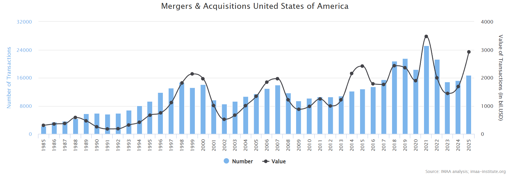 If you were to search up "[Herfindahl-Hirschman Index](https://en.wikipedia.org/wiki/Herfindahl%E2%80%93Hirschman_index#:~:text=HHI%20is%20calculated%20by%20squaring,share%2C%20weighted%20by%20market%20share.) by industry", you will find no relevant recent results. Yet corporate mergers and acquisitions continue unabated as the plot below from the [Institute of Mergers, Acquisitions and Alliances](https://imaa-institute.org/mergers-and-acquisitions-statistics/united-states-ma-statistics/) attests to.